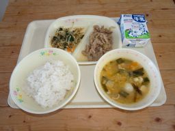 今日は世界の料理を楽しむワールドランチです。今日は、「韓国」の料理を取り入れました。「ビビンバ」は韓国の混ぜご飯です。ご飯の上に肉の炒め物とナムルをのせて、混ぜて食べます。ナムルは、野菜や山菜などをゆでて、ごま油や塩、ニンニクなどで味つけした韓国料理です。豆もやしやゼンマイ、大根やなすなど、様々な種類のナムルがあり、観光では「ナムルにならない野菜はない」ともいわれています。今日のナムルには切干大根を入れました。また、韓国では、もちや団子もよく食べられているので、キムチスープには白玉だんごを入れました。