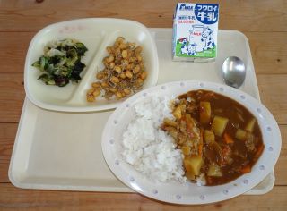 豆は、漢字で「大きな豆」と書きます。名前の由来は、「大いなる豆」で、立派な豆という意味からきているそうです。大豆は「畑の肉」とも言われ、血や肉になる「たんぱく質」をたくさん含んでいます。また、カルシウムも多く、骨や歯をじょうぶにしてくれます。成長期のみなさんにとって、必要な栄養ばかりです。