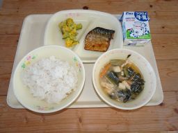 今日はふるさと給食です。給食に使われている、静岡県でとれた(つくられた)食べ物は牛乳、米、かぼちゃ、油揚げ、そして焼津港で水揚げされたサバです。