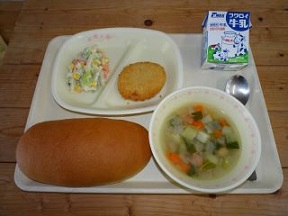 今日はワールドランチで、南アメリカの”ブラジル”にちなんだ献立にしました。コシーニャは、ブラジルの家庭料理の一つで、ほぐした鶏肉を衣で包み、油で揚げたブラジル風のコロッケです。「コシーニャ」とはポルトガル語で「小さいもも」といい、先がとがったかわいい形が「鶏のもも」に似ていることから名づけられました。また、ブラジルでは豆を料理に使うことが多く、地方によって黒や赤のいんげん豆、白のそら豆など、たくさんの種類の豆が使われます。今日は、白いんげん豆を使ったスープにしました。