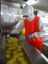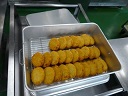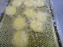 ***給食室の様子*** 今日のコシーニャは、ジャガイモ主体の鶏肉が入ったコロッケです。揚げている時に破裂しないように注意しながら、外側はサクッと、中はホクホクをめざして揚げました♪
