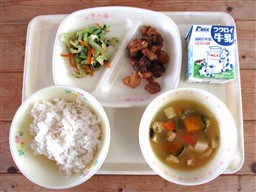 今日の給食には、鉄分が多く含まれる「レバー」や「こまつな」を取り入れました。鉄分をしっかりとって、貧血を予防しましょう。