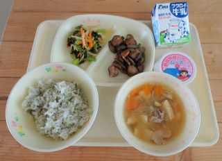 今日の給食に入っている静岡県でとれた食べものは、牛乳、お茶、こめ、かつお、小松菜、もやし、豆腐、油揚げ、豚肉、ねぎ、たまねぎ、いちごです。お茶や小松菜、ねぎは牧之原市の長谷川さんや中田さん、加藤さんが作ってくれたものです。「地元の子どもたちのために」と、心をこめてお茶や小松菜、ねぎを作ってくれています。身近な人たちが作ってくれる食べ物を大切にいただきたいですね。