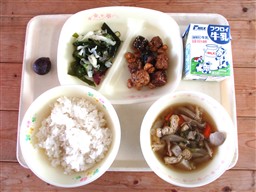 9月18日は「敬老の日」でした。日本は、世界中でも健康で長生きをする国の一つです。理由は、栄養バランスのよい日本食にあるといわれています。栄養バランスのよい食事の覚え方に、「まごわやさしい」という言葉があります。これは、食事に取り入れたい食材の頭文字を、語呂合わせにしたものです。豆類の「ま」、ごまの「ご」、わかめの「わ」、野菜の「や」、魚の「さ」、しいたけの「し」、いも類の「い」です。今日の給食にも、「まごわやさしい」の食材を取り入れました。自分の食事を考えて、元気に過ごすことができるようにしましょう。