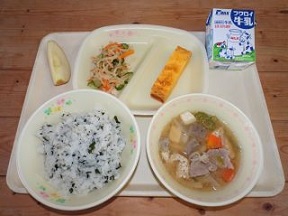 わかめなどの海藻は、私たちの食卓にいろいろな形で使われています。今日のごはんに入っているわかめは、みそ汁や酢の物に、昆布はおでんなどの煮物や汁物のうま味として大切な働きをします。他にも、ひじきやのり、もずくなどがあります。どの海藻にも、お腹などの調子を整える食物繊維や、骨や歯を強くし成長に大切なカルシウムなどのミネラル、体の調子を整えるビタミンなど、日本人に不足しがちな栄養がたっぷり含まれています。今日のわかめごはんも、海藻の風味を楽しみながらいただきましょう。