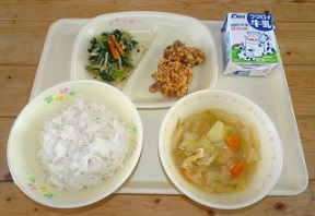 白菜は、英語で「チャイニーズ・キャベツ」といわれる中国生まれの野菜です。中国から種が持ち帰られて、日本で広く作られるようになりました。お腹のなかを掃除してくれる食物繊維や抵抗力を高めるビタミンCがたくさん含まれています。また、寒い季節になると、白菜の葉が凍らないように葉の中に糖分をためるため、甘くなる特徴があります。味にくせがないため、いろいろな料理に使われます。今日はみそ汁に白菜を入れ、この季節ならではのみそ汁です。