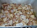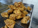 <下味をつけた鶏肉> <衣をつけて手早く油の中へ> <できあがり>