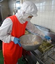 ***給食室の様子*** 久しぶりの”唐揚げ”でした。しょうゆと生姜、にんにく、酒、塩を混ぜて鶏肉に1時間近く漬け込み、小麦粉と片栗粉を混ぜた粉をつけて揚げました。外はカラッと中はジューシーにやわらかく・・・を目指しながら調理しました♪