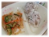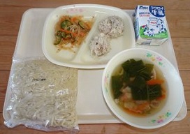 今日の給食は真珠だんごです。肉だんごのまわりに、もち米をつけて蒸して作ります。蒸したもち米が真珠のように輝くので「真珠だんご」という名前がつきました。元々は中華料理で、「ぎょうざ」や「しゅうまい」と同じ点心の仲間です。今日の給食の真珠だんごは、調理員さんがひとつひとつ丸めて作りました。手間ひまと愛情がたっぷりつまっている一品です。