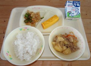 今日の給食に入っている静岡県でとれた食べものは、牛乳、米、たまご、かつおぶし、きゅうり、たまねぎ、豚肉です。
